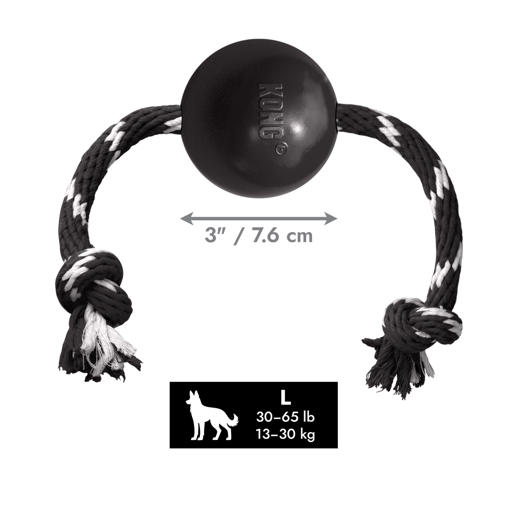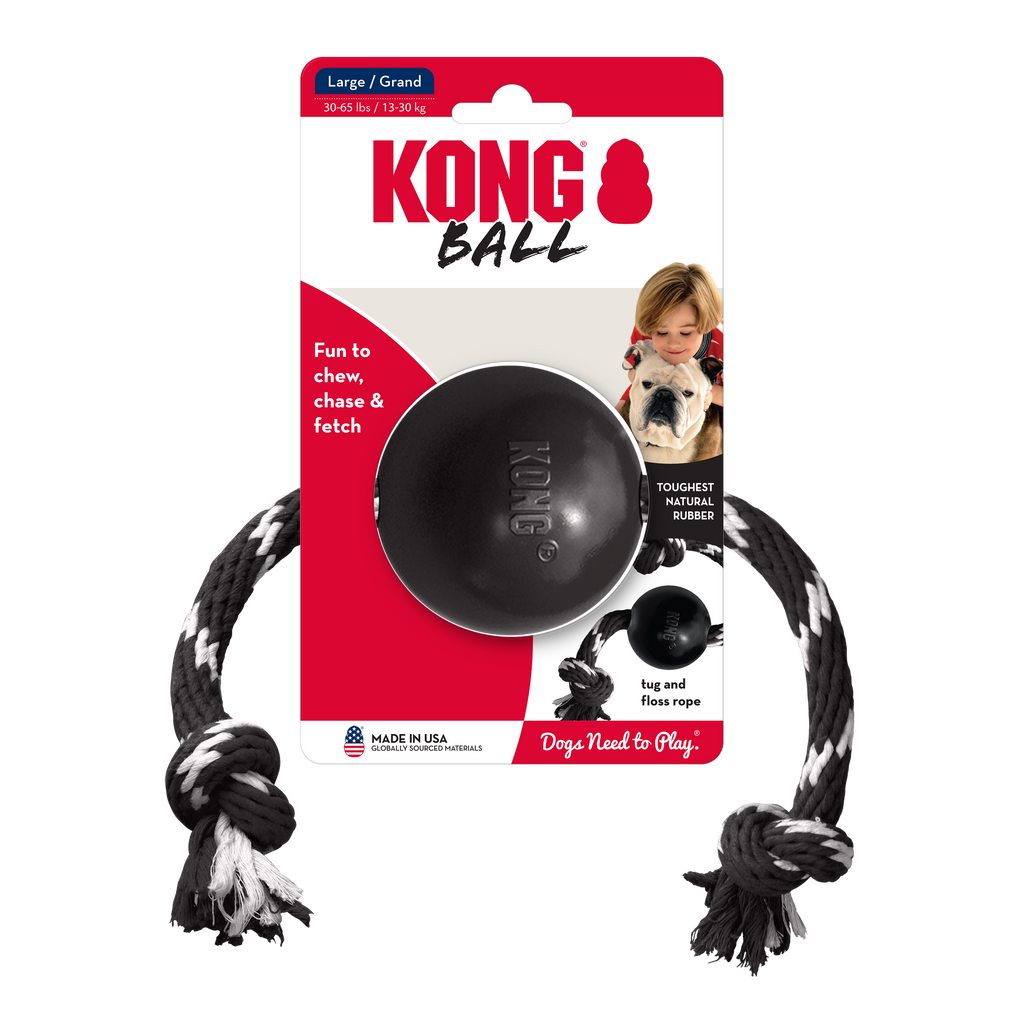 The Extreme KONG Ball with Rope adds long-lasting diversity to games of fetch and tug. Made from KONG Extreme rubber, the ball is designed for durability for long-lasting interactive play. The 100% cotton rope also rewards appropriate chewing behavior while massaging teeth and gum. All of this adds up to playful bouts of mentally stimulating and enriching engagement.