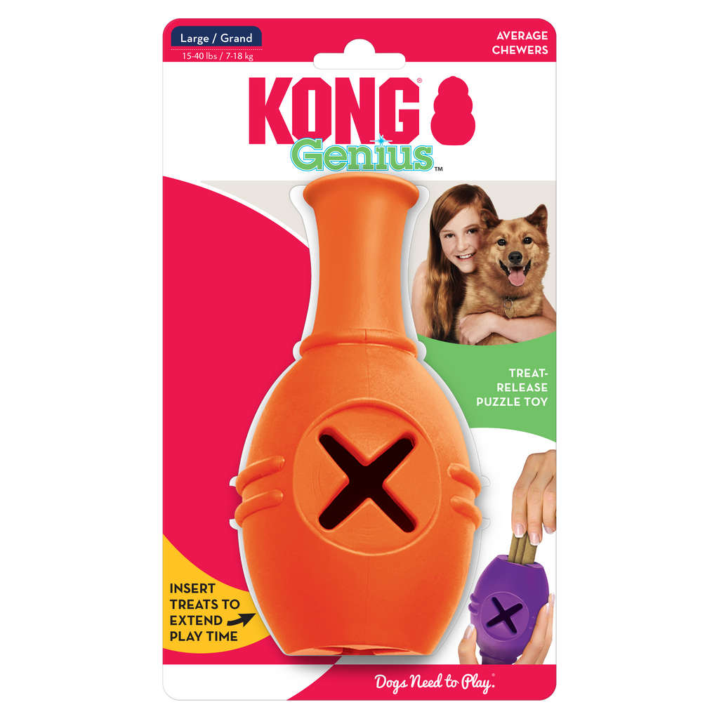 The KONG Genius Leo is named in honor of Leonardo Da Vinci and is designed to stimulate a dog’s curiosity and hold its attention. The toy is great for helping combat boredom and separation anxiety and can be used as a treat dispensing toy on its own - or connected to the Genius Mike for an increased challenge. Genius toys are great for puppies and adult dogs alike.