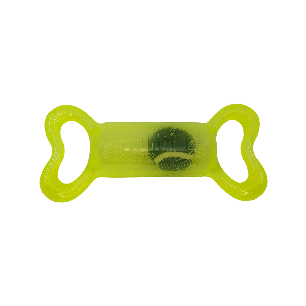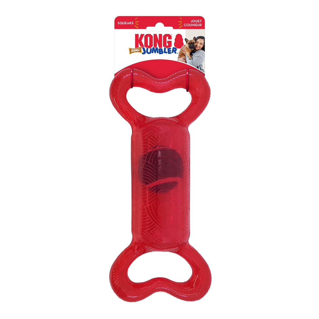 KONG Jumbler Tug Bone’s rolling interior tennis ball and loud squeak spark tug-and-fetch fun. This durable toy is built to last through tough play with two handles that make tugging and shaking easy for long-lasting rounds of interactive play.