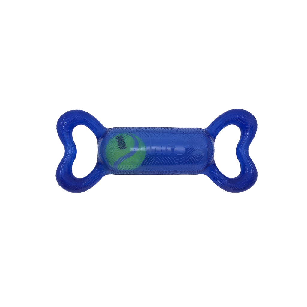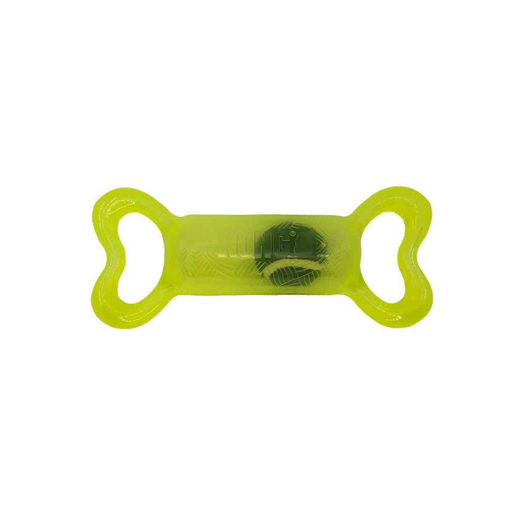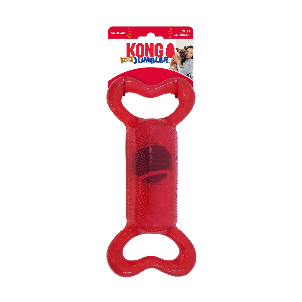 KONG Jumbler Tug Bone’s rolling interior tennis ball and loud squeak spark tug-and-fetch fun. This durable toy is built to last through tough play with two handles that make tugging and shaking easy for long-lasting rounds of interactive play.