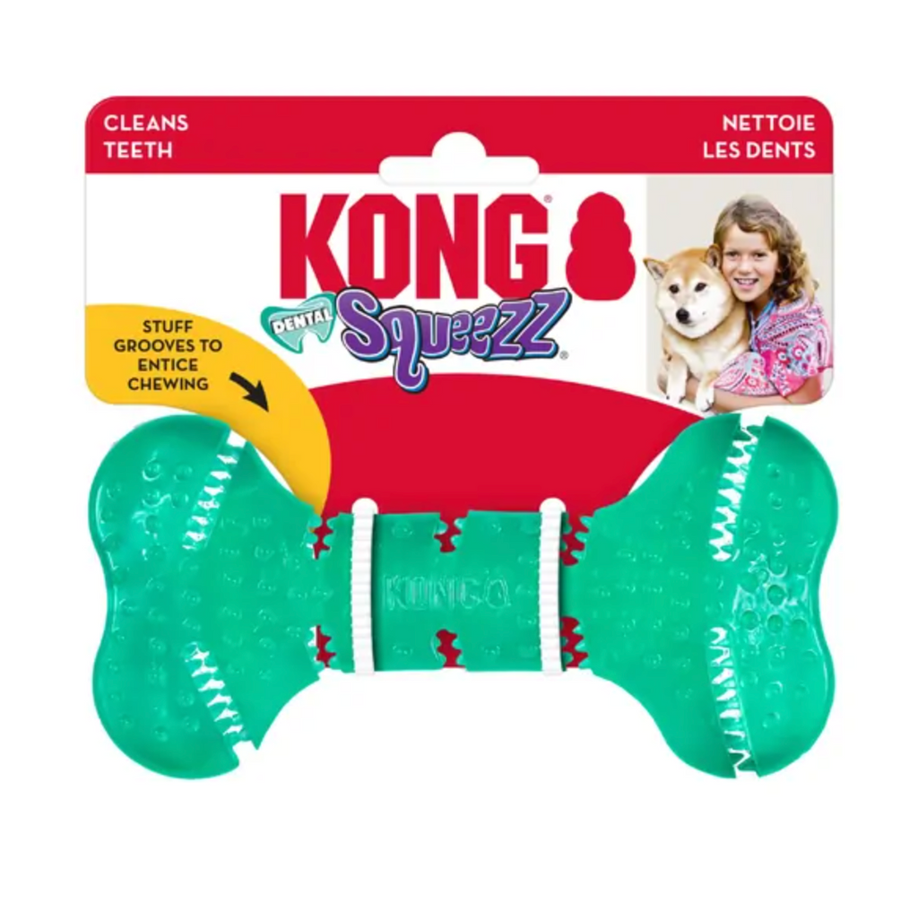 KONG Dental Squeezz toys satisfy dogs’ instinctual need to chew as the textured nubs reward appropriate behavior while cleaning teeth. Stuffing with treats and its flexible material add to the engagement while extending playtime. The way the toy flexes as dogs chew allows for a deeper clean. Chewing on the KONG Dental Squeezz is a fun way to help prevent clinical teeth and gum conditions.