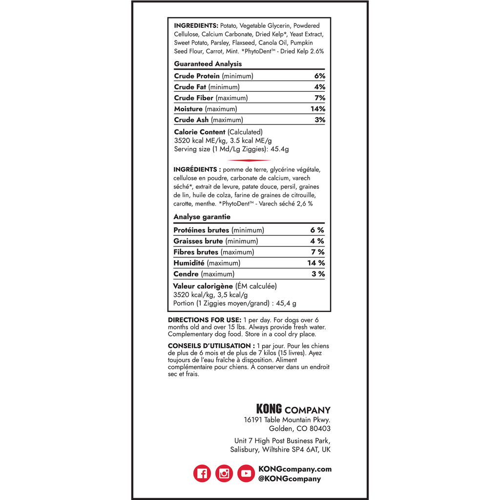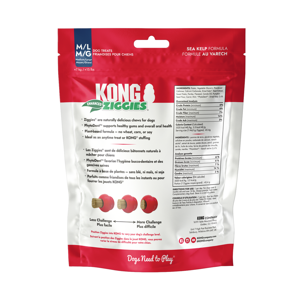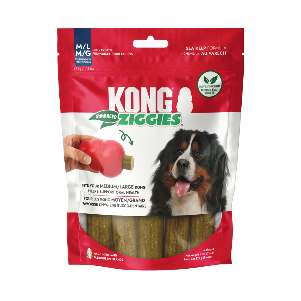 KONG Ziggies Enhanced are naturally delicious chews that help support your dog's oral health. These dog treats can prevent plaque buildup and promote fresh breath while satisfying their chewing instincts. Enriched with PhytoDent™ sea kelp, Ziggies Enhanced contain antioxidants, vitamins, minerals, and proteins. These dog treats are wonderful on their own or can be used to stuff inside KONGs and KONG Tires. Plus, these plant-based treats are free from wheat, corn, and soy, in case your dog has specific allergies. You can support your dog's overall oral health by giving them a KONG stuffed with Ziggies Enhanced and topping it with Easy Treat!
