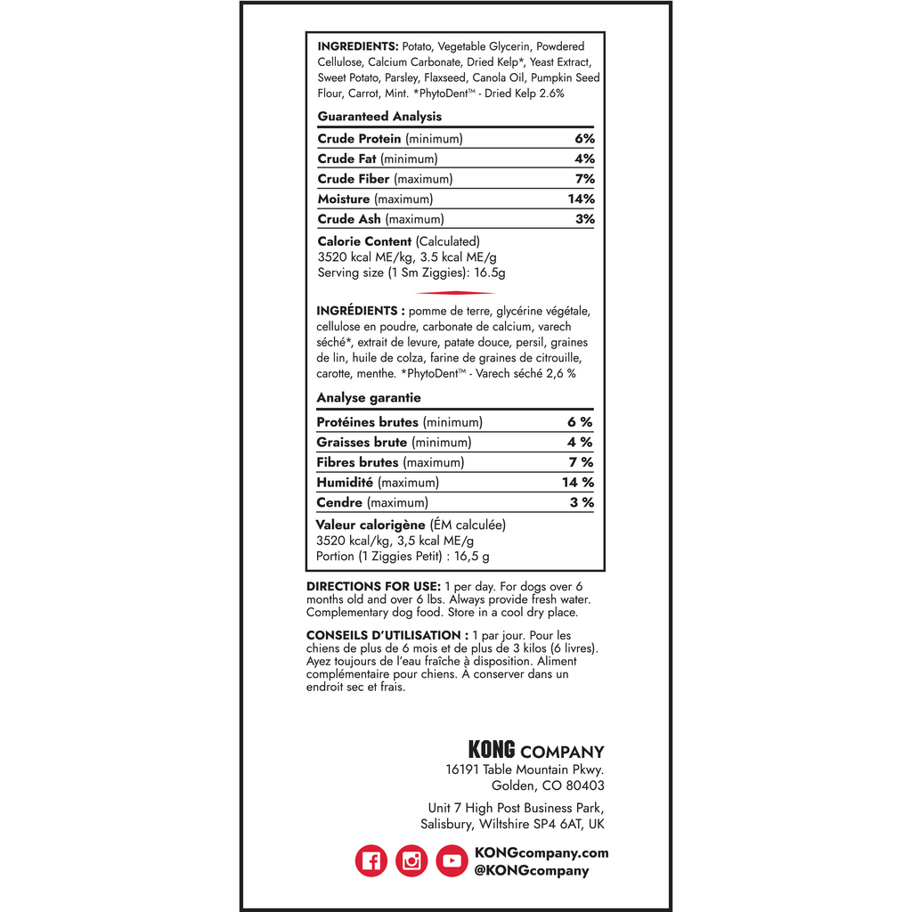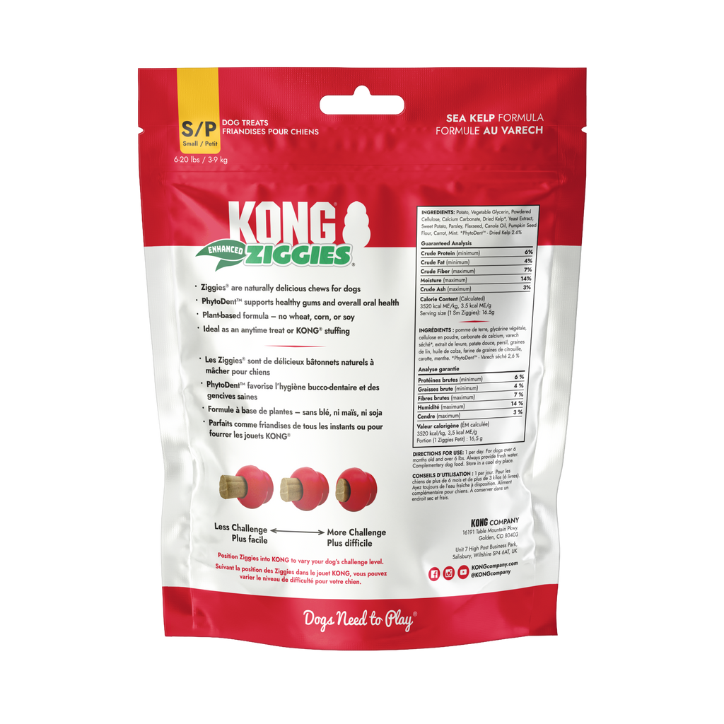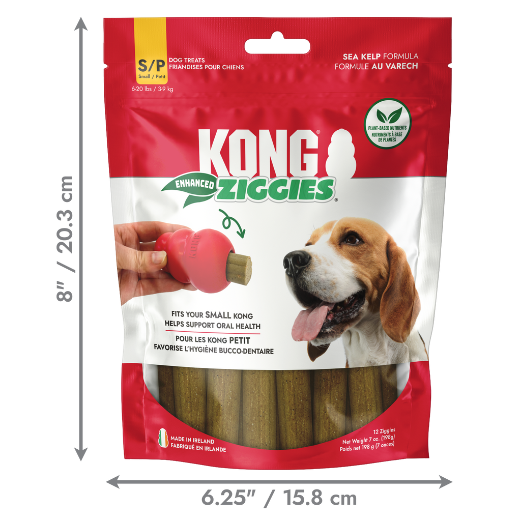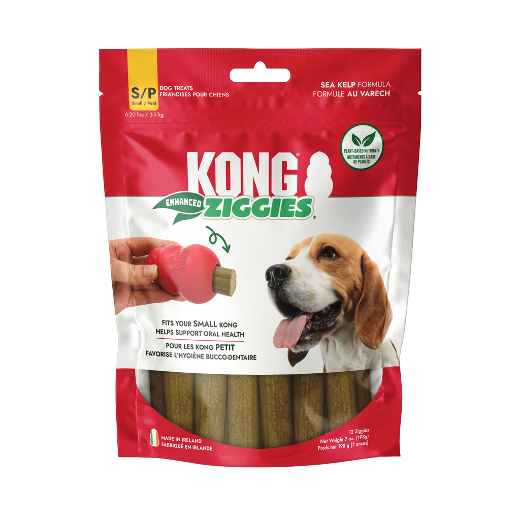 KONG Ziggies Enhanced are naturally delicious chews that help support your dog's oral health. These dog treats can prevent plaque buildup and promote fresh breath while satisfying their chewing instincts. Enriched with PhytoDent™ sea kelp, Ziggies Enhanced contain antioxidants, vitamins, minerals, and proteins. These dog treats are wonderful on their own or can be used to stuff inside KONGs and KONG Tires. Plus, these plant-based treats are free from wheat, corn, and soy, in case your dog has specific allergies. You can support your dog's overall oral health by giving them a KONG stuffed with Ziggies Enhanced and topping it with Easy Treat!